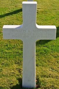 Sgt Donald A. Vincent enlisted on 23 July 1943 in Miami Beach, Florida. He was employed as a Ticket Agent.The aircraft B-17G, 44-6568, was the victim of an attack by several ME-262 enemy fighters on the mission of 17 April 1945. The aircraft was hit immediately before bombs away. The right wing tip appeared to be hit badly and pieces of metal were seen to tear off of the wing. The ship left formation under control and was observed to hold a straight course off of the target. It did not make a turn to return to our lines but instead held a heading approximately that of the bomb run. The aircraft was watched for several minutes after it left formation and no fires were visable. The aircraft also seemed to be well under control, and, the chances for the crew to escaped seemed very good. No men were seen to leave the aircraft or parachutes open.