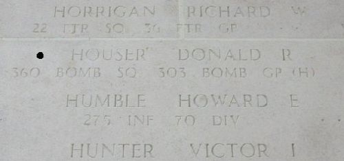 Sgt Houser came out of his burning turret, badly wounded and died of blood loss. He was first buried on the grounds of the fortress of Borsbeek, together with the other crew members who didn't survive the crash. After the war their bodies were moved, but Sgt Houser was never found.