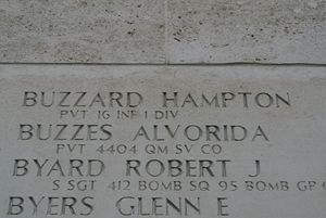 Pvt Hampton Buzzard enlisted at Fort Sill, Oklahoma on 26 February 1944.He was declared officially dead one day and one year after he was reported missing in action.