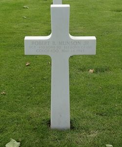 Robert B. Munson, Jr. graduated from Boulder High School in 1941. He attended college for a year before he joined the Air Corps of the U.S. Army Reserve in Pueblo, Colorado on 14 December 1942.The aircraft received a direct flak hit in the cockpit and was seen to crash and explode one mile south of Bonefeld, Germany. One parachute was observed to come out of the waist window.