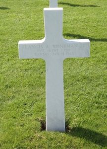 Pvt Francis A. Brinkman Jr. enlisted at Fort Leavenworth, Kansas on 15 September 1943.He attended high school for 3 years. He arrived overseas April, 1944, serving in England, France, Belgium and Germany with the First Division of the First Army. He was seriously wounded January 12, 1945 and died the following day.