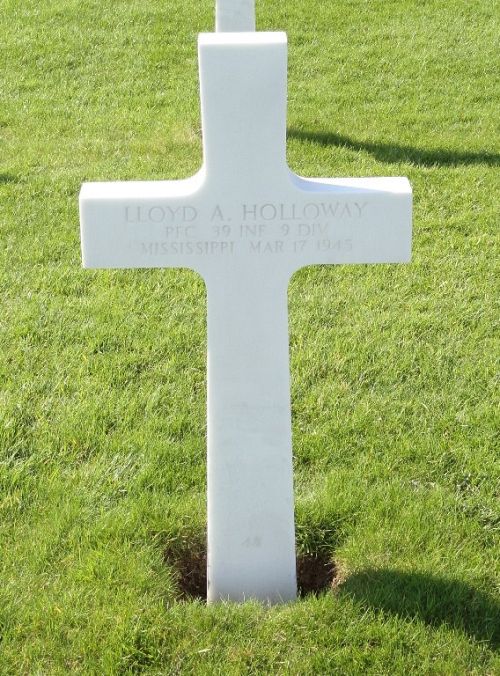 Pfc Lloyd A. Holloway worked on a farm before he enlisted at Camp Shelby, Mississippi on 5 November 1943.Source of information: Peter Schouteten, www.abmc.gov, www.archives.gov - WWII Enlistment Record, www.ancestry.com - U.S., Headstone and Interment Records for U.S. Military Cemeteries on Foreign Soil, http://9infantrydivision.net