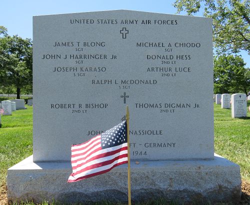The only returning crew eyewitness report stated briefly that this plane was seen peeling off after the enemy fighter attacks with the right elevator appearing to be badly shot up, and that no chutes were seen. There were no additional reports on the loss of this aircrew and ship in the MACR.