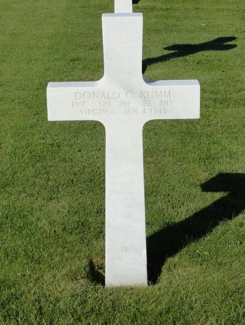 Pvt Donald C. Kumm joined the Regular Army on 11 July 1939, landed in Africa in December 1942, served through the African-Tunesian campaign, the invasion of Sicily, Italy. He was moved to northern Italy and then to southern France.He was first buried at the Temporary American Military Cemetery of Foy, Belgium.
