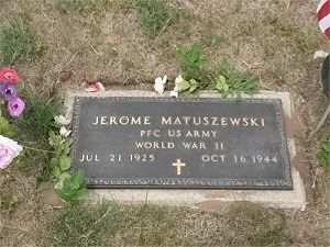 Pfc Jerome Matuszewski graduated from the Rogers City High School in 1942. He entered the service on 14 October 1943.He is remembered at the Saint Dominic Cemetery in New Metz, Presque Isle County, Michigan.