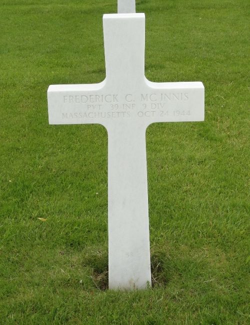 Pvt Frederick C. Mc Innis was a painter before he enlisted at Fort Devens, Massachusetts on 3 March 1944.Source of information: Peter Schouteten, Carla Mans, www.abmc.gov, www.wwiimemorial.com, www.archives.gov - WWII Enlistment Record, www.ancestry.com - Headstone and Interment Record / U.S. WWII Draft Cards Young Men/ 1940 Census, http://9thinfantrydivision.net