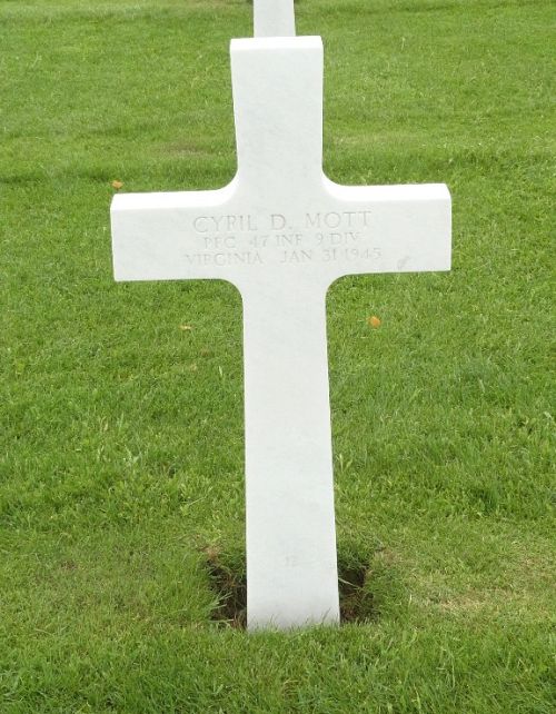 Pfc Cyril D. Mott was a retail manager before he enlisted at Fort George G. Meade, Maryland on 17 March 1944.Source of information: Peter Schouteten, Carla Mans, www.abmc.gov, www.wwiimemorial.com, www.archives.gov - WWII Enlistment Record, www.ancestry.com - Headstone and Interment Record / U.S. WWII Draft Cards Young Men / 1930 Census, http://9thinfantrydivision.net