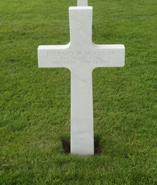 Bernard Mulligan enlisted on 17 April 1944 and was overseas since October 1944.Source of information: Raf Dyckmans, Carla Mans, Kathy McDermott, www.abmc.gov, www.wwiimemorial.com, www.ancestry.com - Headstone and Interment Record / U.S. WWII Draft Cards Young Men / Michigan, U.S. Marriage Records / 1930/1940/1950 Census