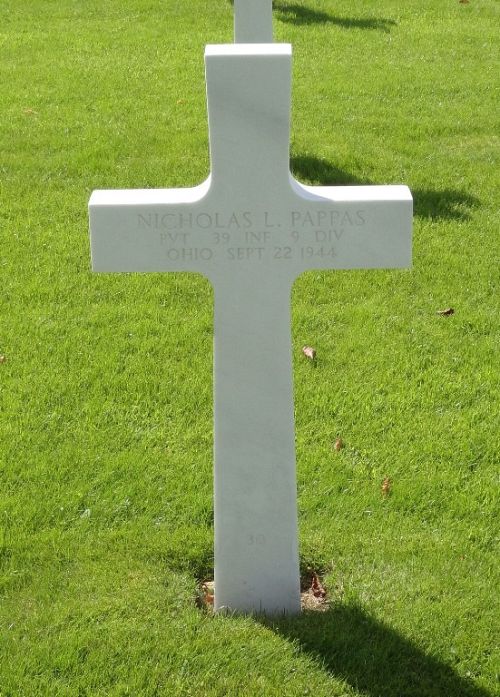 Pvt Nicholas L. Pappas worked in a dairy factory before he enlisted on 17 April 1940.He was first buried at the Temporary American Military Cemetery of Fosse, Belgium.