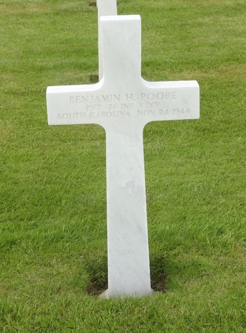 Pvt Benjamin H. Poore was a foreman before he enlisted at Camp Craft, South Carolina on 2 December 1943.Source of information: Raf Dyckmans, Hannah Majewski, Carla Mans, www.abmc.gov, www.wwiimemorial.com, www.archives.gov - WWII Enlistment Record, www.ancestry.com - Headstone and Interment Record / U.S. WWII Draft Cards Young Men