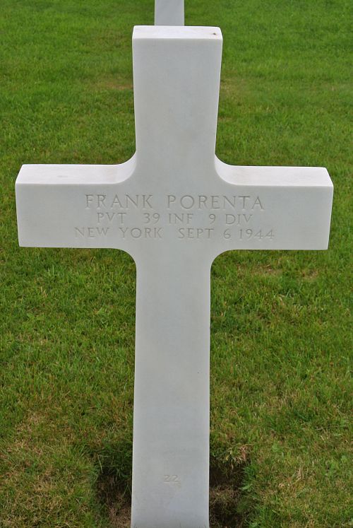 Pvt Frank Porenta was a cook before he enlisted in New York City, New York, on 5 February 1944.He was first buried at the Temporary American Military Cemetery of Fosse, Belgium.