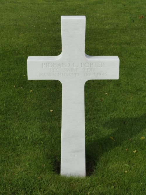 Pfc Richard L. Porter graduated from Wakefield High School in 1940 and was employed by the American Photographic Publishing Company before he enlisted in Boston, Massachusetts on 5 March 1943.Source of information: Peter Schouteten, Carla Mans, www.abmc.gov, www.wwiimemorial.com, www.archives.gov – WWII Enlistment Record, www.ancestry.com - Headstone and Interment Record / U.S. WWII Draft Cards Young Men / 1930 Census, http://9thinfantrydivision.net