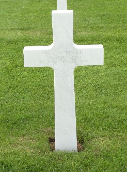 Pfc Fred R. Privett enlisted at Fort Benjamin Harrison, Indiana on 30 January 1941.He attended high school for 2 years and was a laboratory technician before he enlisted. He landed on Omaha Beach on D-Day. He died of wounds received in action December 22 in Belgium.