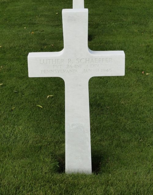 Pvt Luther R. Schaeffer graduated from Allentown High School in 1937 and worked for the Mechanical Service Company.He enlisted in New Cumberland, Pennsylvania on 1 June 1941. He trained at Camp Wheeler, Georgia, Fort Benning, Georgia and Fort Meade, Maryland.