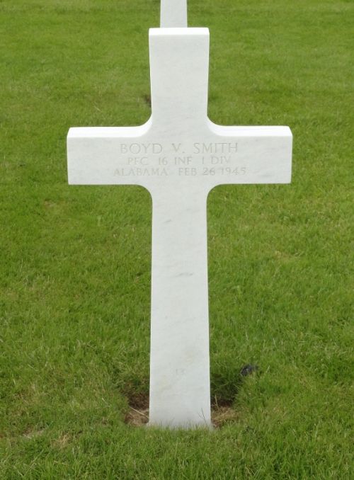 Pfc Boyd V. Smith enlisted at Fort McClellan, Alabama on 12 March 1943.He attended high school for 4 years and worked on a farm before he enlisted. He landed on Omaha Beach on D-Day.