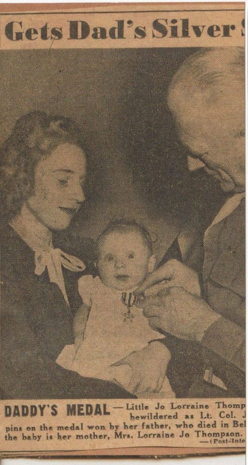 He was awarded the Silver Star Medal posthumously. The citation cited: For gallantry in action in the vicinity of Faymonville, Belgium, 17 January 1945. When assault elements were impeded by an intense automatic-weapons and small-arms barrage from a building occupied by the enemy, Lt Thompson courageously led a group across perilous terrain to the strongpoint. Then, with utter disregard for personal safety, he fearlessly engaged the foe and, with accurately directed grenades, compelled the hostile force to surrender. Lt Thompson’s gallant actions and outstanding devotion to duty exemplify the finest traditions of the service.