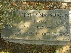 Pvt Robert P. Matson Jr. enlisted at Fort Jackson, South Carolina on 29 September 1943.Source of information: Peter Schouteten, www.abmc.gov, www.wwiimemorial.com, www.archives.com - WWII Enlistment Record, www.findagrave.com - Saratoga