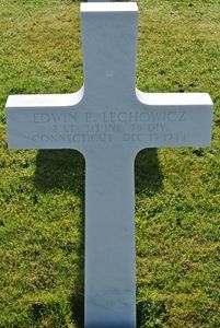 2nd Lt Edwin P. Lechowicz was a graduate of Hartford Public High School in 1937.He had been a member of the Connecticut National Guard for about a year prior it being federalized in 1941. He went to the Pacific theater with the 169th Regiment where he was stationed for 15 months. Returning to the States he was graduated from Officer Candidate School at Fort Benning with a commission of second lieutenant 21 August 1943.