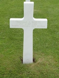 Pvt Thomas Breeze Jr. worked on a farm before he enlisted at Fort Bragg, North Carolina on 30 September 1943.Pvt Breeze was initially buried in a temporary grave at Margraten on 29 December 1944 as Unknown X-65. Before the burial, his fingerprints were taken and the form was photographed and used for comparison of the fingerprints in his file in Washington DC. On 5 May 1945 a reply was received, confirming his identification.