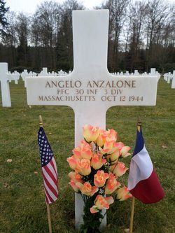 Pfc Anzalone was awarded the Silver Star Medal posthumously for his action on 7 October 1944, in the vicinity of Le Tholy, France. He crossed 300 yards in open field under fire to reach a friendly tank and direct its fire against two German machinegun nests.