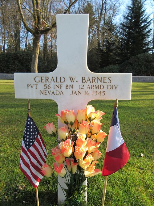 Pvt Gerald W. Barnes attended Sparks High School for four years before he enlisted in Salt Lake City, Utah on 29 June 1943. He had been serving overseas since October 1944.Source of information: Peter Schouteten, www.abmc.gov, www.wwiimemorial.com, www.archives.gov - WWII Enlistment Record, www.ancestry.com - Headstone and Interment Record / 1930 Census / U.S. WWII Draft Cards Young Men, www.12tharmoredmuseum.com, www.findagrave.com, www.newspapers.com - Nevada State Journal 31 January 1945