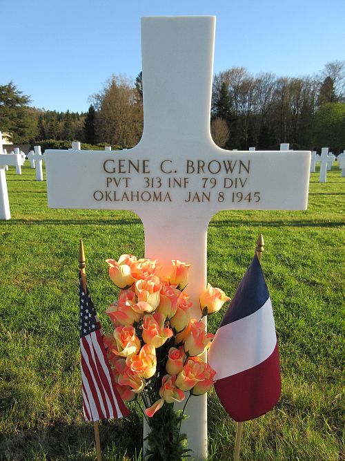 Pvt Gene C. Brown worked on the family farm before he enlisted in Oklahoma City, Oklahoma on 19 November 1943. He was sent overseas in June 1944.He was killed by artillery shell fragments to his chest.