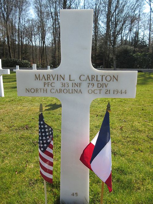 Pfc Marvin L. Carlton attended Bethesda High School and was employed at the Durham Transportation Company before he enlisted at Fort Bragg, North Carolina on 5 August 1943. He was sent overseas in June 1944.He was killed by small arms fire in his leg.