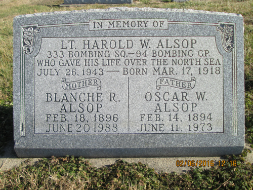 Lt. Harold W. Alsop graduated from Allendale High School (Illinois) in 1936 where he played basketball for four years and was in the Future Farmers of America organization. In January of 1937, he enlisted in the Army and was certified as an air mechanic. He entered flight school in 1942 and shortly thereafter earned his wings.Lt. Alsop is remembered at the Allendale Cemetery in Allendale, Wabash County, Illinois.