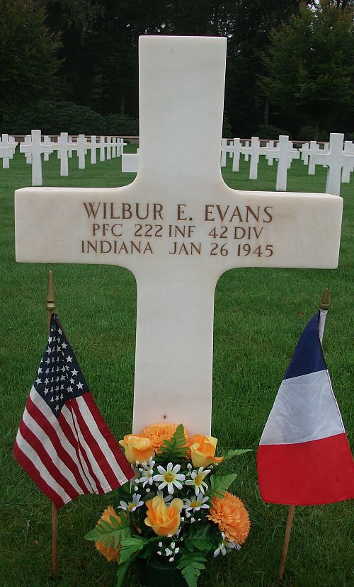 Pfc Wilbur E. Evans attended high school for 4 years before he enlisted in Louisville, Kentucky on 6 January 1944.He was killed when he was hit by a piece of shrapnel in the head. According to witnesses he probably would have lived had he stayed on the ground, but he got up and started running around among the men, moaning and praying for God to let him die. He thought he was blind for his cap had slipped over his eyes and he couldn't see. His comrades tried to get him to lay down but he wouldn't listen. He was finally picked off by a German rifleman.