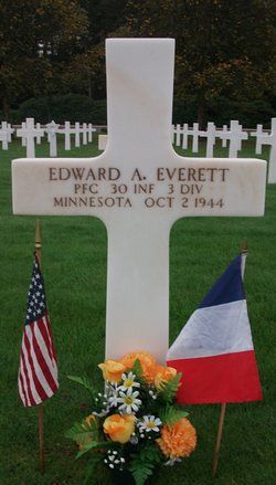 Pfc Edward A. Everett graduated from Carlton High School before he joined the National Guard at Fort Snelling, Minnesota on 3 August 1942.He was killed by small arms fire.
