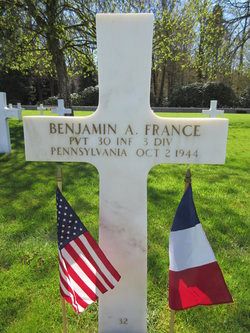 Pvt Benjamin A. France attended high school for one year and was a production worker, employed by the Blawn Steel Co. before he enlisted in Greensburg, Pennsylvania on 27 December 1943.In September 1944 he was wounded by small arms fire in the neck but returned to duty very soon.