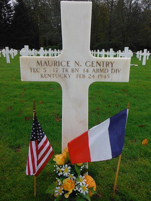 T/5 Maurice N. Gentry worked on a farm before he enlisted in Louisville, Kentucky on 25 November 1942.He was wounded on 21 December 1944 and died as a result of these wounds on 24 February 1945.