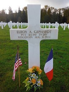 Pvt Elroy A. Gephardt was employed at the Midstate Shoe Company before he enlisted.He was first buried at the Temporary American Military Cemetery in Solers, France.