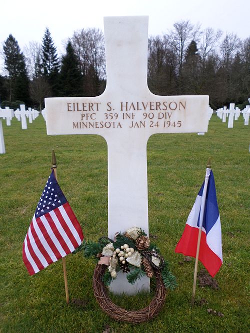 Pfc Eilert S. Halverson was first buried at the Temporary American Military Cemetery in Solers, France.Source of information: Peter Schouteten, www.abmc.gov, www.wwiimemorial.com, www.ancestry.com - Headstone and Interment Record / U.S. WWII Draft Cards Young Men, www.findagrave.com