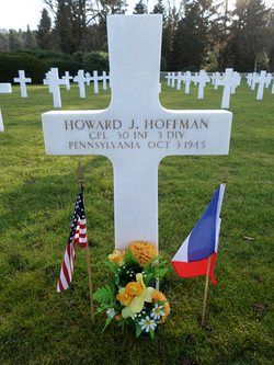 Cpl Howard J. Hoffman was employed by the West View Bowling Alley when he enlisted on 16 February 1942.According to his hospital admission card he died of wounds, caused by small arms fire in October 1944. Also a newspaper article in The Pittsburgh Press of 26 October 1944 announced that relatives were informed of his death on 3 October 1944. It is therefore not clear why his date of death was officially recorded on 3 October 1945.