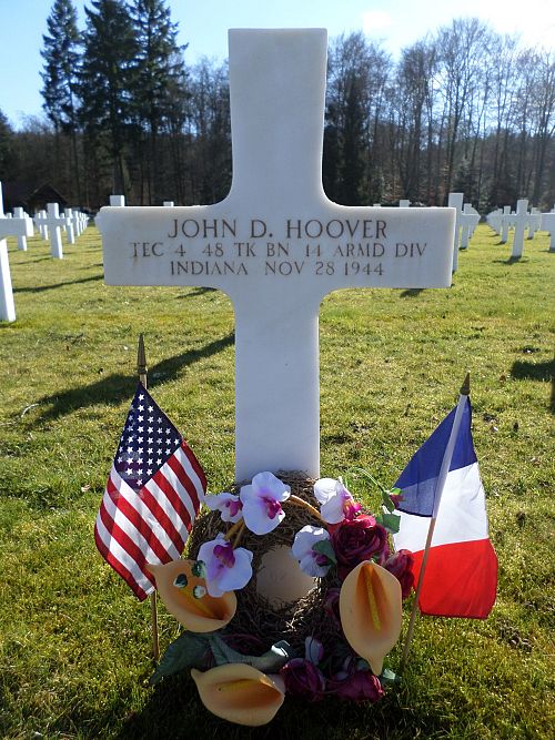 T/4 John D. Hoover enlisted in Indianapolis, Indiana, on 24 November 1942 and was sent overseas in October 1944.Source of information: Peter Schouteten, www.abmc.gov, www.wwiimemorial.com – Harry F. Hoover, www.archives.gov – WWII Enlistment Record, www.ancestry.com - Headstone and Interment Record / Ochiltree Wms Family Tree / 1930 Census, www.findagrave.com – Kristin, http://14thad.org, www.newspapers.com – The Star Press 28 December 1944 / Muncie Evening Press 27 December 1944