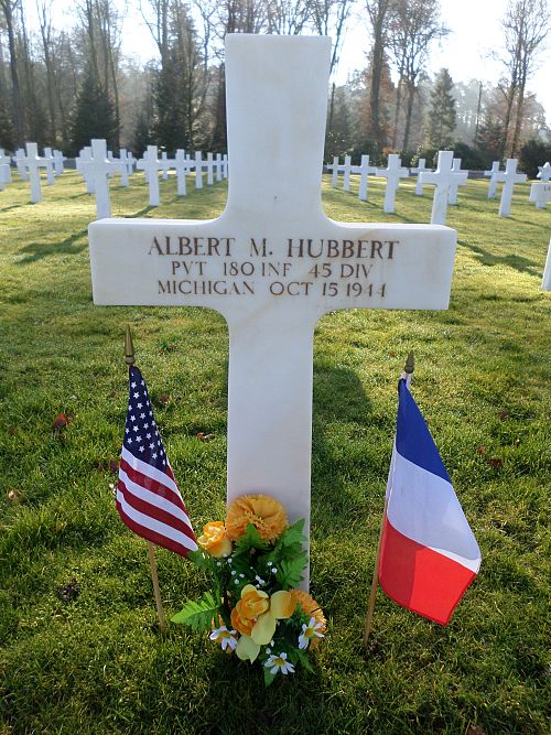Pvt Albert M. Hubbert was inducted in January 1944 and went overseas in July 1944.Source of information: Peter Schouteten, www.abmc.gov, www.wwiimemorial.com, www.ancestry.com - Headstone and Interment Record / Phelps Kohler Family Tree / Hubbert Family Tree, http://www.45thdivision.org, www.findagrave.com, www.newspapers.com – Ironwood Daily Globe Michigan 5 December 1944