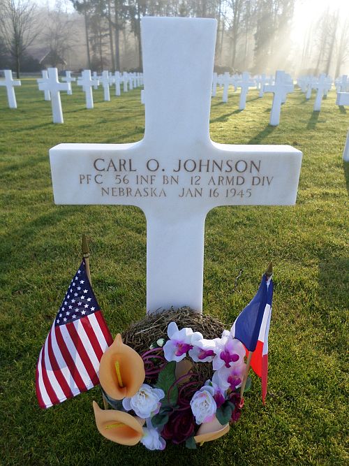 Pfc Carl O. Johnson was killed by shrapnel.Source of information: Peter Schouteten, www.abmc.gov, www.wwiimemorial.com, www.ancestry.com - Headstone and Interment Record / Selway Johnson Tree / 1910 Census / U.S. WWII Draft Cards Young Men, www.12tharmoredmuseum.com, www.findagrave.com – Linda Berney