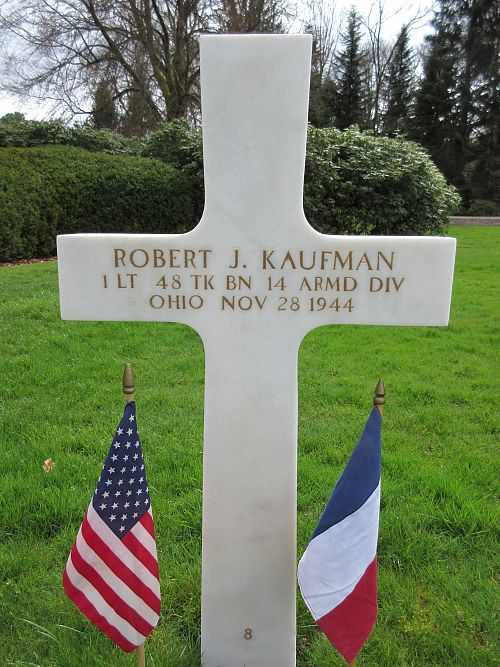 1st Lt Robert J. Kaufman attended college for two years and was a mechanic and repairman before he enlisted in Cleveland, Ohio on 12 May 1941.While rescuing members of his tank crew, Lt Kaufman was wounded in action. He was taken prisoner and died as a result of these wounds in a German hospital in the town of Barr, France.