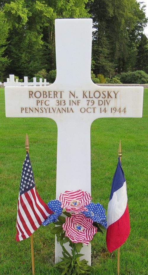 Pfc Robert N. Klosky attended Shaler High School for four years and was employed at the Glenshaw Glass Company before he enlisted in Pittsburgh, Pennsylvania on 2 June 1943.He was killed by artillery shell fragments to his neck and chest.