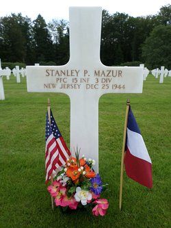 Pfc Stanley P. Mazur attended high school for four years and was a shipping supervisor employed by the Celluloid Corporation before he enlisted in Newark, New Jersey on 5 January 1944.He was killed by artillery shell fragments.