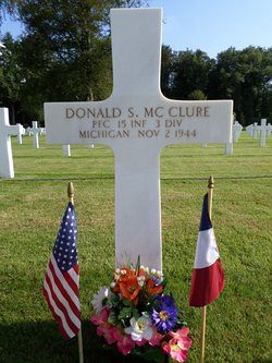Pfc Donald S. McClure graduated from Jacksonville High School and was a sales clerk, employed by the Atlantic & Pacific Tea Company, before he enlisted in Kalamazoo, Michigan on 1 December 1942.Source of information: Leo Minne, www.abmc.gov, www.wwiimemorial.com, www.ancestry.com - Headstone and Interment Record / 1930/1940 Census / U.S. WWII Draft Cards Young Men / U.S. WWII Hospital Admission Cards, History 3rd Infantry Division WWII