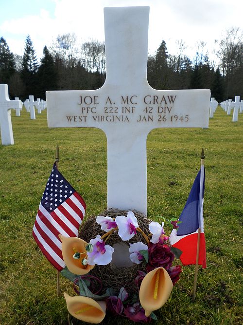 Pfc Joe A. McGraw enlisted in Huntington, West Virginia on 7 April 1941.Pvt Herman J. Bergeth saw Pvts Franklin Van Nest and Joe A. McGraw and one other GI engaged in hand-to-hand combat in a ditch with several Germans. According to Bergeth, Van Nest, a big man, was wielding a knife as large as a Roman short sword. They seemed to have won their struggle when a couple of German grenades were tossed into the ditch, wounding both men. Germans firing submachine guns came in on the left, threatening to outflank the Americans. Pvt Robert Owen killed four before Bugno withdrew his men to the site of their earlier fight, where they would be supported by Peck's machine gun. There they managed to stop the German advance. Although wounded, Van Nest and McGraw refused to retreat and continued to kill the few Germans who tried to advance. When word came from battalion of a possible tank attack from the direction of the Mill d'Uhrbruck, Bugno sent back for bazookas. No tanks came, but German voices were heard. Then, German artillery fire began falling on them. Realizing that they had been zeroed in, Bugno ordered his men to retire. As they stood up to retreat, artillery rounds killed Bugno, McGraw and Van Nest. The rest fell back, several of them wounded by shrapnel. They could hold out no longer, but they had done their job. They had blunted the German effort toward Neubourg.
