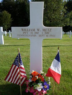 Pvt William W. Metz attended high school for one year and worked on the Kirk Falk Farm before he enlisted in Harrisburg, Pennsylvania on 6 April 1943. He was sent overseas in July 1944.He was killed by artillery shell fragments in the thigh and loin.