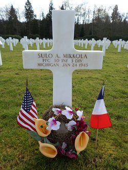 Pfc Sulo A. Mikkola was a press operator, employed by the De Soto Chrysler Corp. before he enlisted on 6 April 1944.He was killed by artillery shell fragments in the face.