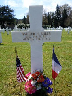 Pfc Walter J. Mills graduated from the Blair Jr. High School and was a chauffeur at the Burns and Roe Inc. on the Naval Operating Base in Norfolk.He enlisted in Richmond, Virginia on 5 March 1943.