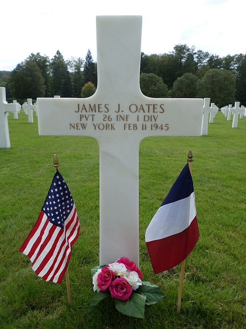 Pvt James J. Oates was first buried at the Temporary American Military Cemetery in Solers, France.Source of information: Peter Schouteten, www.abmc.gov, www.wwiimemorial.com – Edward Oates, www.ancestry.com - Headstone and Interment Record