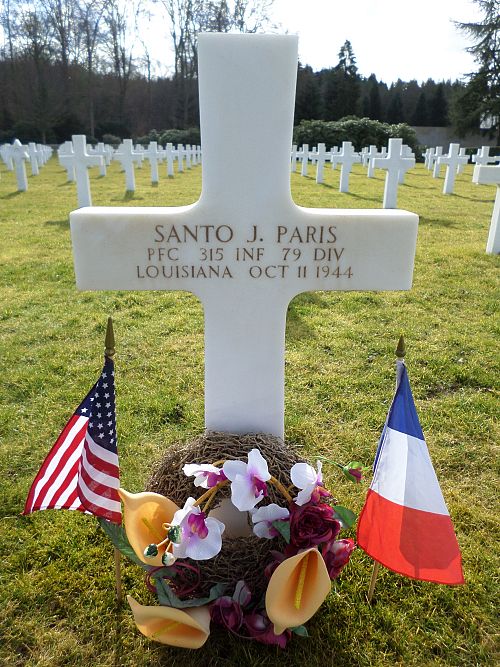 Pfc Santo Paris was a machine maker before he enlisted.Source of information: Peter Schouteten, www.abmc.gov, www.wwiimemorial.com, www.ancestry.com - Headstone and Interment Record / U.S. WWII Draft Card Young Men / 1940 Census / Louisiana Birth Records, Combat History 79th Infantry Division