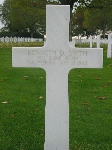 Pfc Kenneth D. Smith enlisted in Los Angeles, California on 23 February 1943.When the 5th was ordered to move a hundred miles northward to join the III Corps of the First Army to assist in reducing what became known as "The Ruhr Pocket", three trapped German divisions who were working their way back to Germany for the defense of the Homeland. The 5th attacked the center of the "pocket" until all resistance ceased. What was left of the enemy in the area can be described as complete devastation they had also been attacked by the Allied Air Forces.