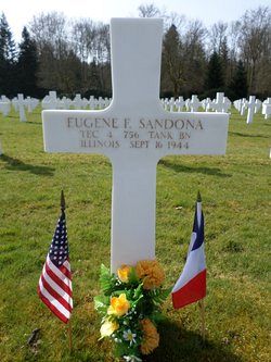 T/4 Eugene F. Sandona was employed by the Ingersail Steel and Disc Co. before he enlisted on 27 June 1942.His tank, on a reconnaissance mission, was disabled by a mine. The company commander, 1st Lt Ralph Hanson and T/4 Sandona were killed.